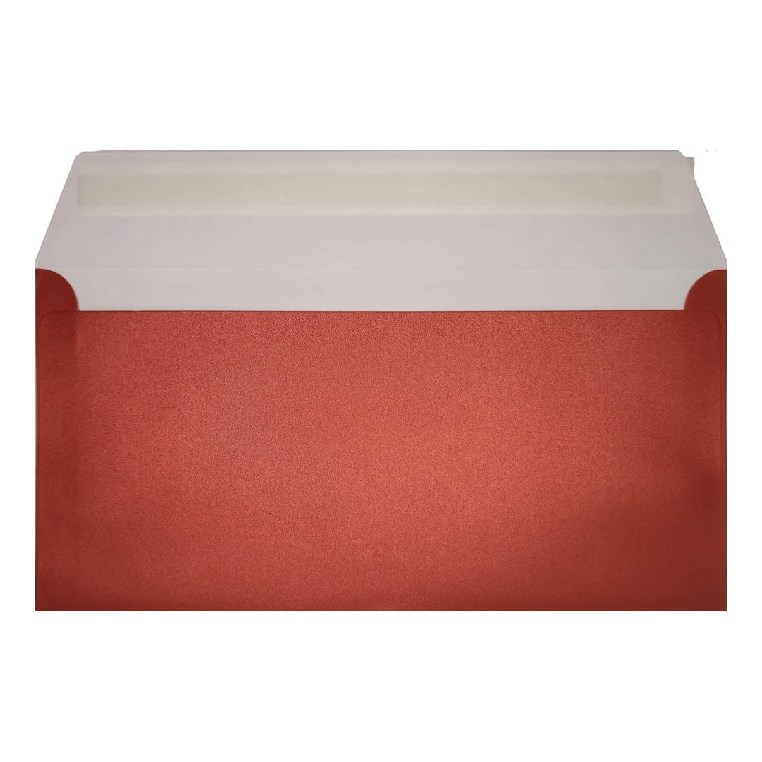 100 Pack – Cardinal Red DL Pearlescent Envelopes. Peel/Seal Wallet Flap. Red 120gsm Pearl Finish. 110mm x 220mm.